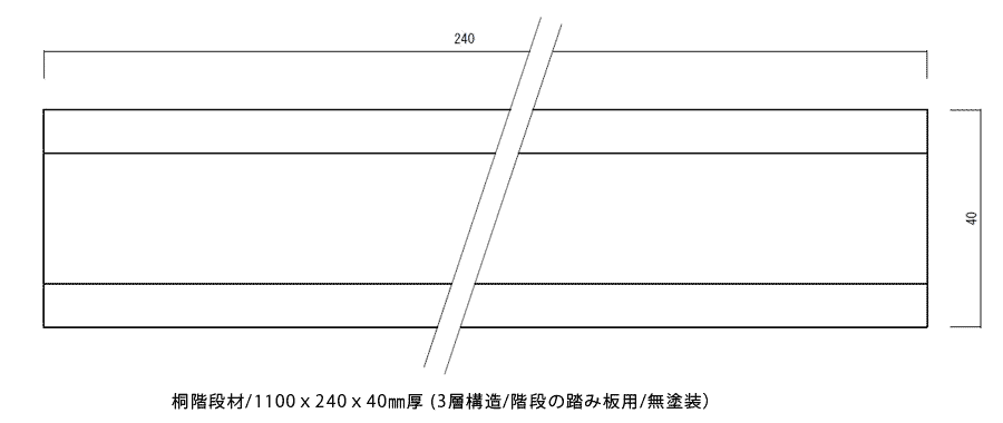 桐の板を3枚張り合わせた3層構造の板で階段の踏み板に使います。1100x240x40mm厚の寸法です。